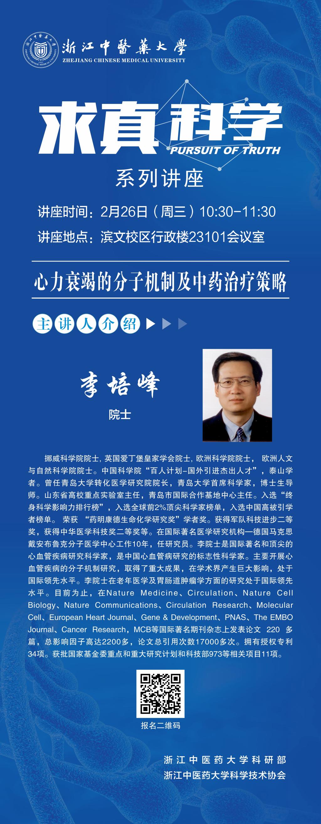 为提升科研创新能力和科学素养,拓展学术领域,营造我校科研学术氛围,学校邀请欧洲科学院李培峰院士现场讲座,主题为:心力衰竭的分子机制及中药治疗策略。现将有关事项通知如下:
