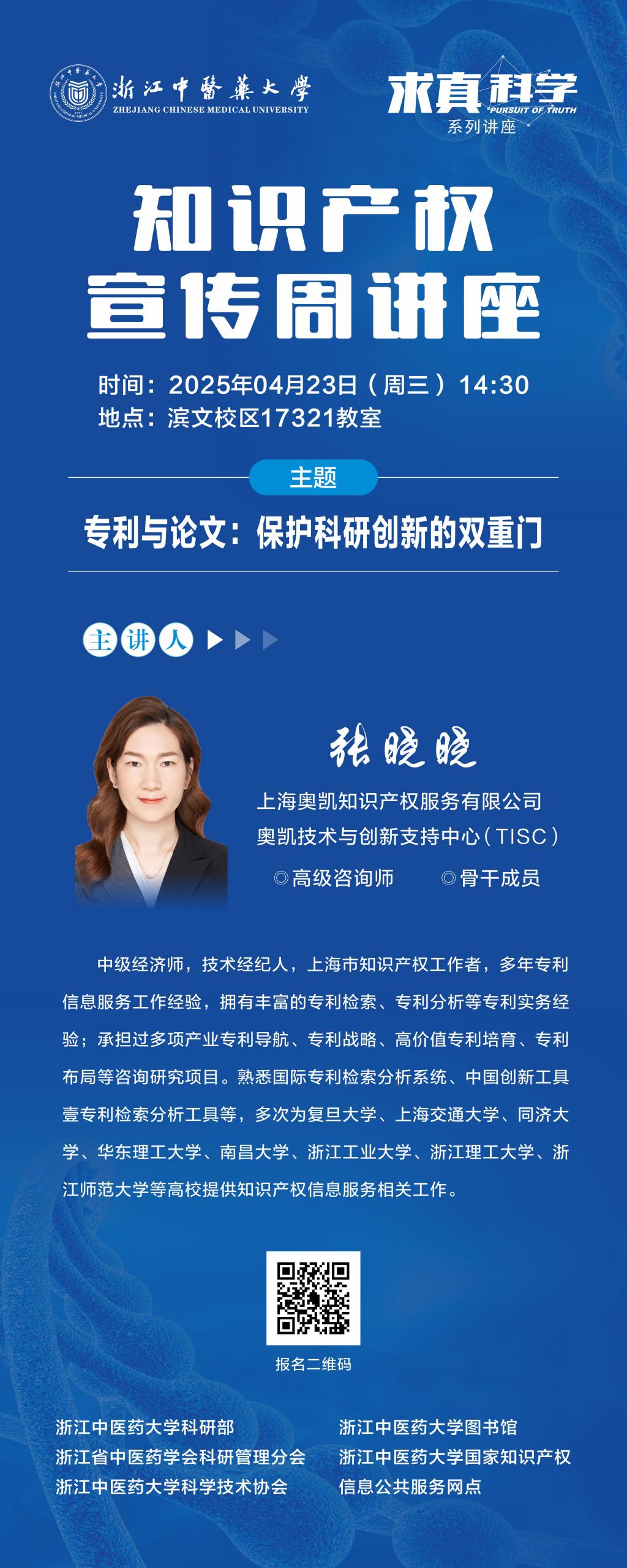 在第25个世界知识产权日来临之际,为提升全社会知识产权尊重和保护意识,加强知识产权保护宣传教育,积极弘扬“尊重知识、崇尚创新、诚信守法、公平竞争”的知识产权文化理念,学校组织开展2025年知识产权宣传周讲座,邀请上海奥凯知识产权服务有限公司张晓晓高级咨询师现场作《专利与论文:保护科研创新的双重门》讲座,助力知识产权事业高质量发展。现将有关事项通知如下:
