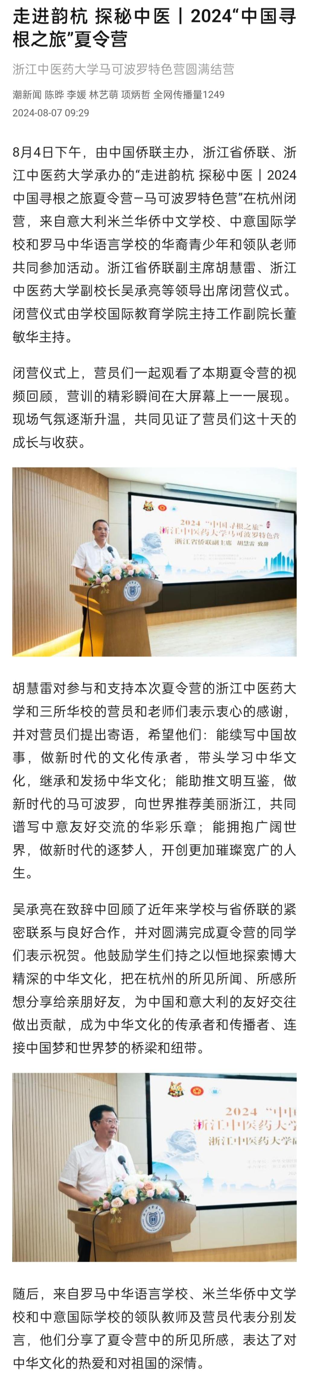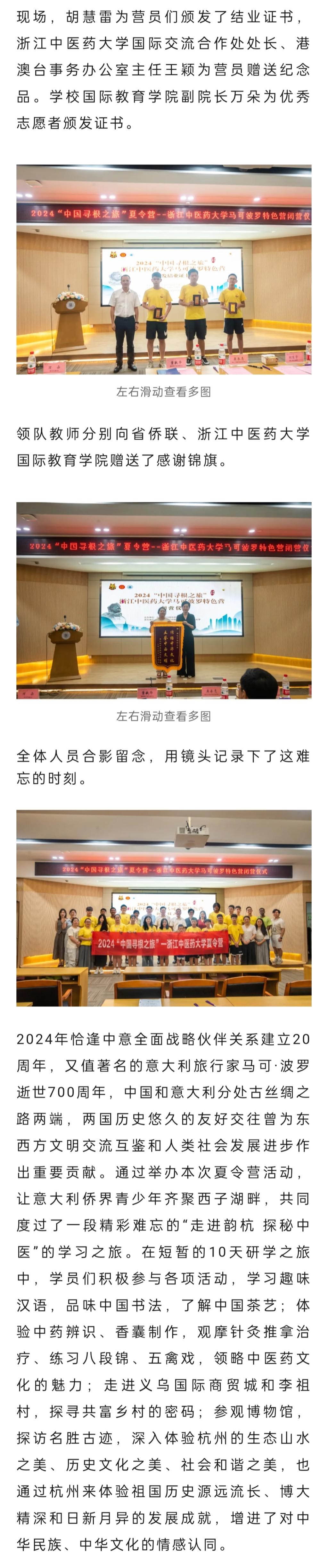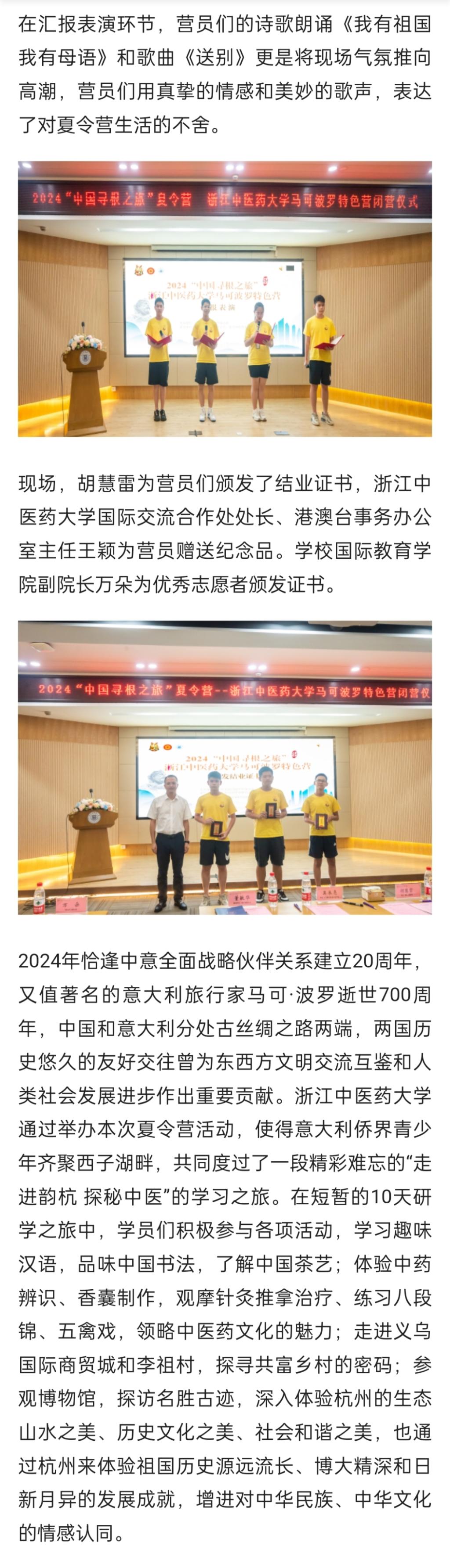 2024年恰逢中意全面战略伙伴关系建立20周年,又值著名的意大利旅行家马可·波罗逝世700周年,中国和意大利分处古丝绸之路两端,两国历史悠久的友好交往曾为东西方文明交流互鉴和人类社会发展进步作出重要贡献。通过举办本次夏令营活动,让意大利侨界青少年齐聚西子湖畔,共同度过了一段精彩难忘的“走进韵杭 探秘中医”的学习之旅。在短暂的10天研学之旅中,学员们积极参与各项活动,学习趣味汉语,品味中国书法,了解中国茶艺;体验中药辨识、香囊制作,观摩针灸推拿治疗、练习八段锦、五禽戏,领略中医药文化的魅力;走进义乌国际商贸城和李祖村,探寻共富乡村的密码;参观博物馆,探访名胜古迹,深入体验杭州的生态山水之美、历史文化之美、社会和谐之美,也通过杭州来体验祖国历史源远流长、博大精深和日新月异的发展成就,增进了对中华民族、中华文化的情感认同。