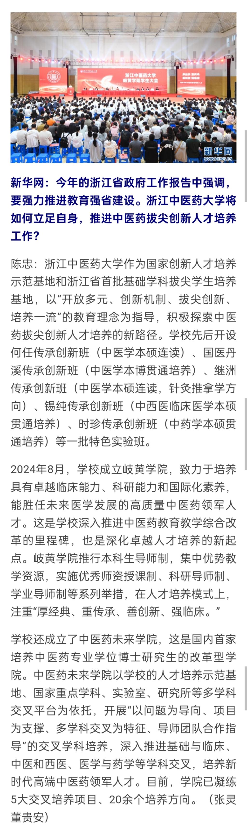 新华网:今年的浙江省政府工作报告中强调,要强力推进教育强省建设。久久精品一区二区三区四区将如何立足自身,推进中医药拔尖创新人才培养工作?