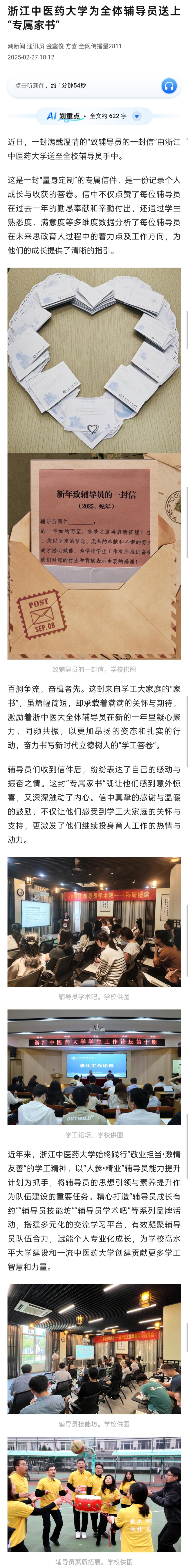 百舸争流,奋楫者先。这封来自学工大家庭的“家书”,虽篇幅简短,却承载着满满的关怀与期待,激励着浙中医大全体辅导员在新的一年里凝心聚力、同频共振,以更加昂扬的姿态和扎实的行动,奋力书写新时代立德树人的“学工答卷”。
