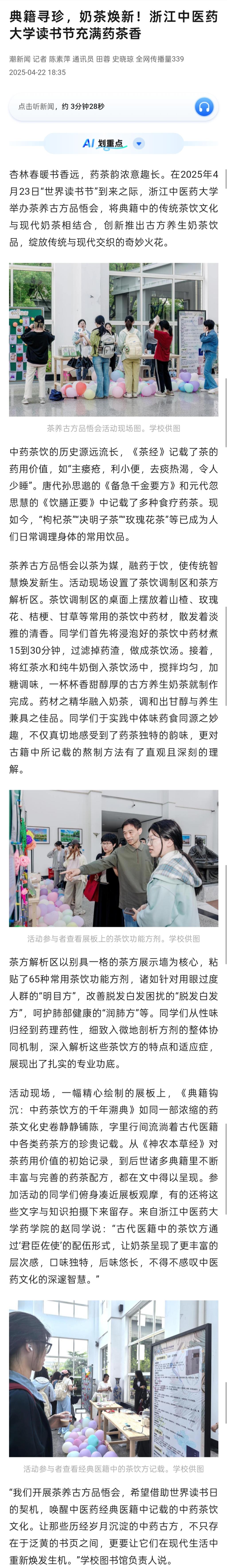 “我们开展茶养古方品悟会,希望借助世界读书日的契机,唤醒中医药经典医籍中记载的中药茶饮文化。让那些历经岁月沉淀的中药古方,不只存在于泛黄的书页之间,更要让它们在现代生活中重新焕发生机。”学校图书馆负责人说。