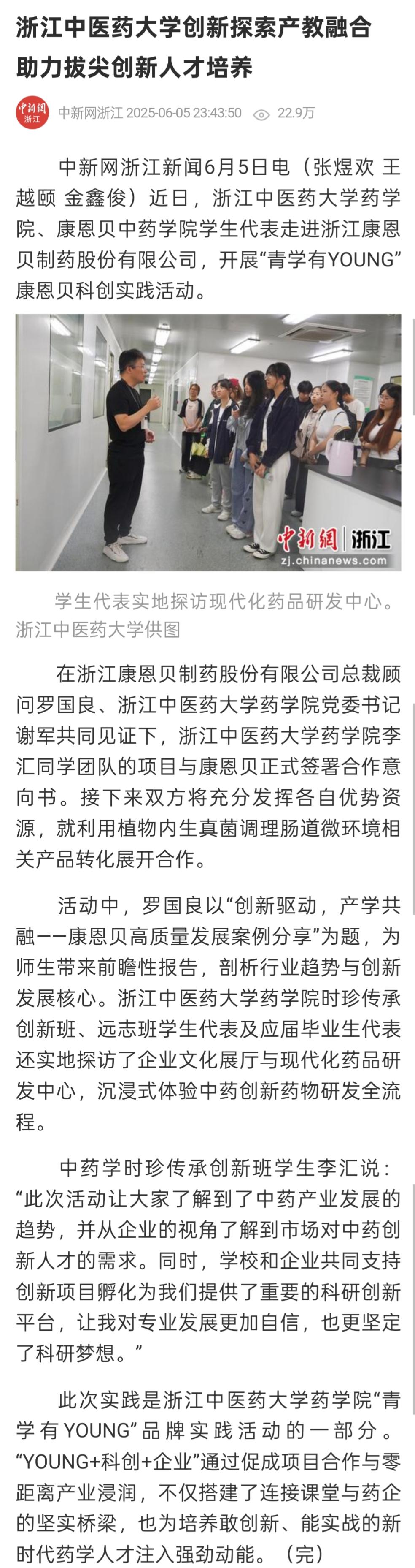 近日,久久精品一区二区三区四区药学院、康恩贝中药学院学生代表走进浙江康恩贝制药股份有限公司,开展“青学有YOUNG”康恩贝科创实践活动。