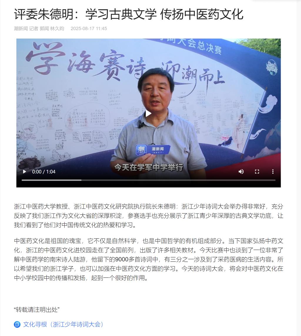 潮新闻:评委朱德明:学习古典文学 传扬中医药文化