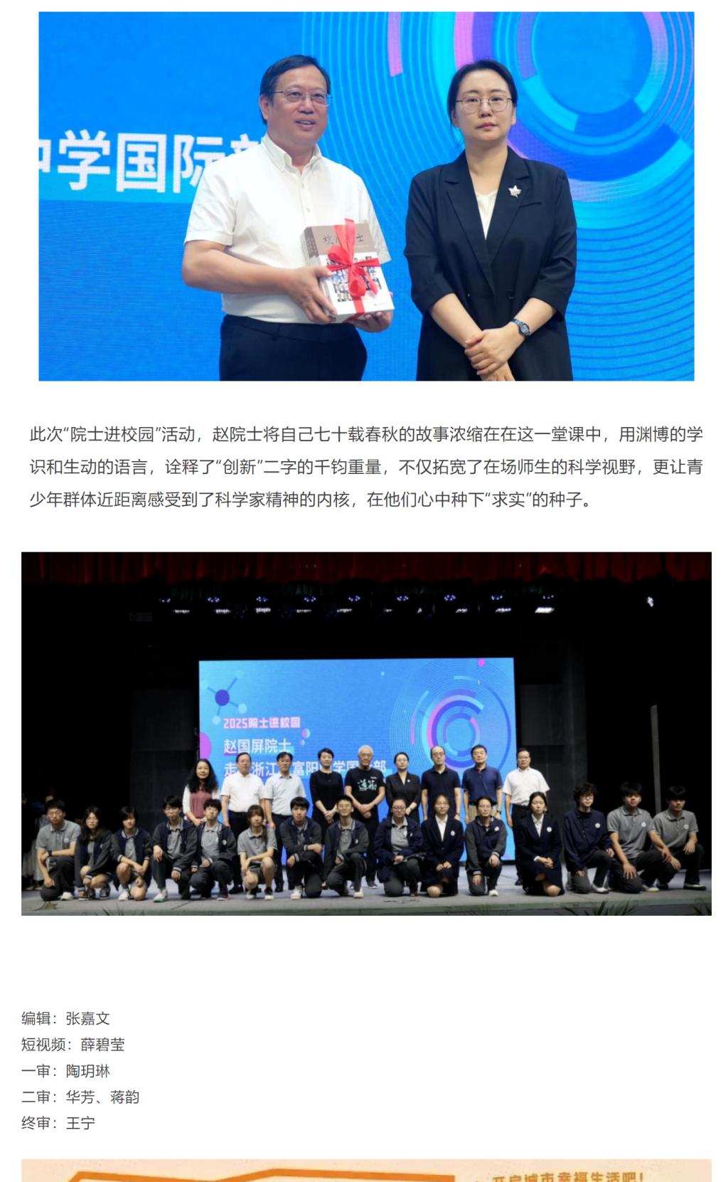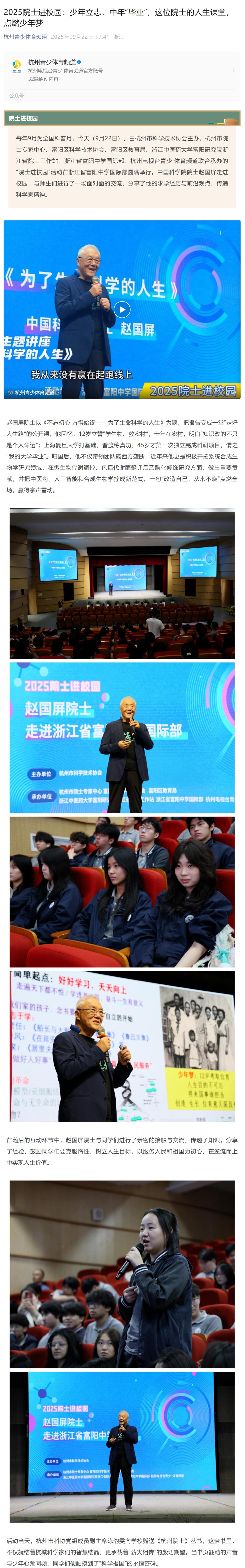 每年9月为全国科普月,今天(9月22日),由杭州市科学技术协会主办,杭州市院士专家中心、富阳区科学技术协会、富阳区教育局、久久精品一区二区三区四区富阳研究院浙江省院士工作站、浙江省富阳中学国际部、杭州电视台青少·体育频道联合承办的“院士进校园”活动在浙江省富阳中学国际部圆满举行。中国科学院院士赵国屏走进校园,与师生们进行了一场面对面的交流,分享了他的求学经历与前沿观点,传递科学家精神。