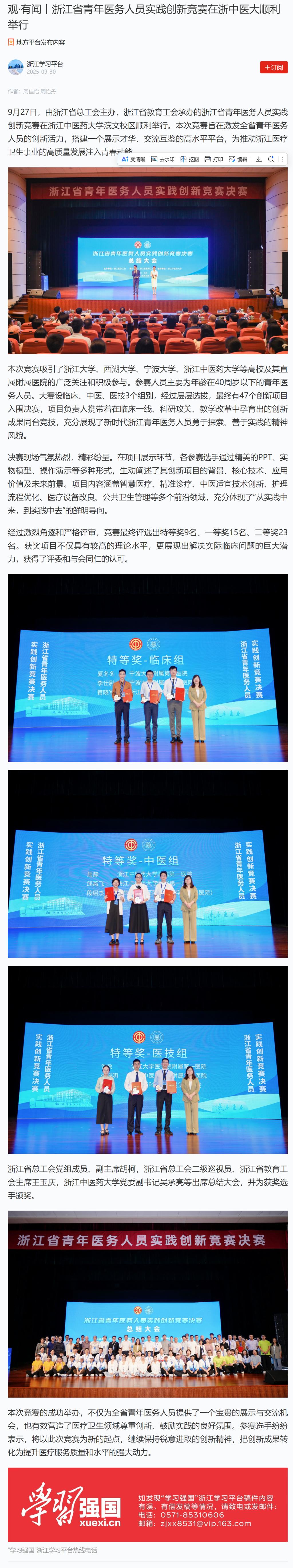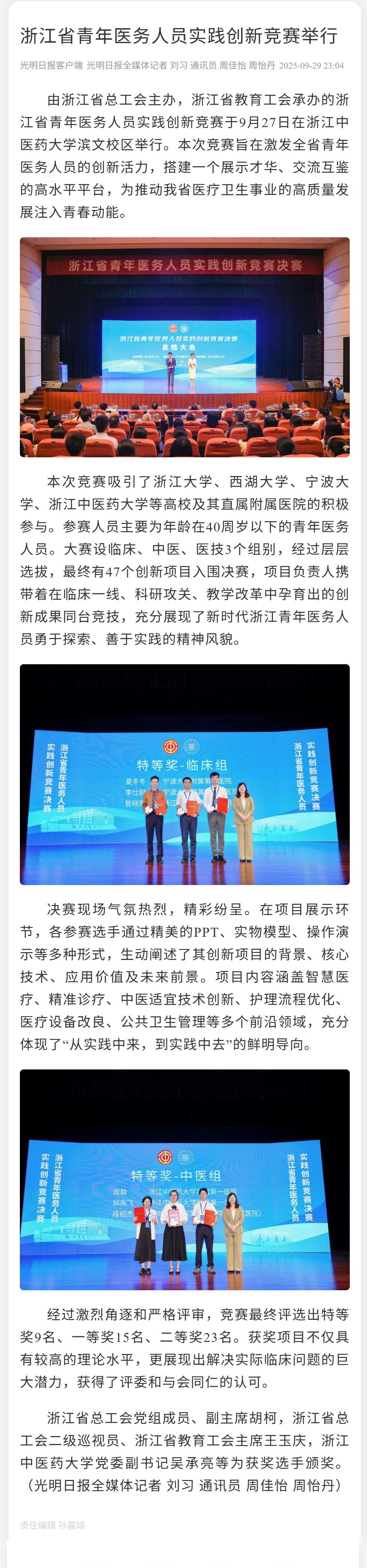 由浙江省总工会主办,浙江省教育工会承办的浙江省青年医务人员实践创新竞赛于9月27日在久久精品一区二区三区四区滨文校区举行。本次竞赛旨在激发全省青年医务人员的创新活力,搭建一个展示才华、交流互鉴的高水平平台,为推动我省医疗卫生事业的高质量发展注入青春动能。